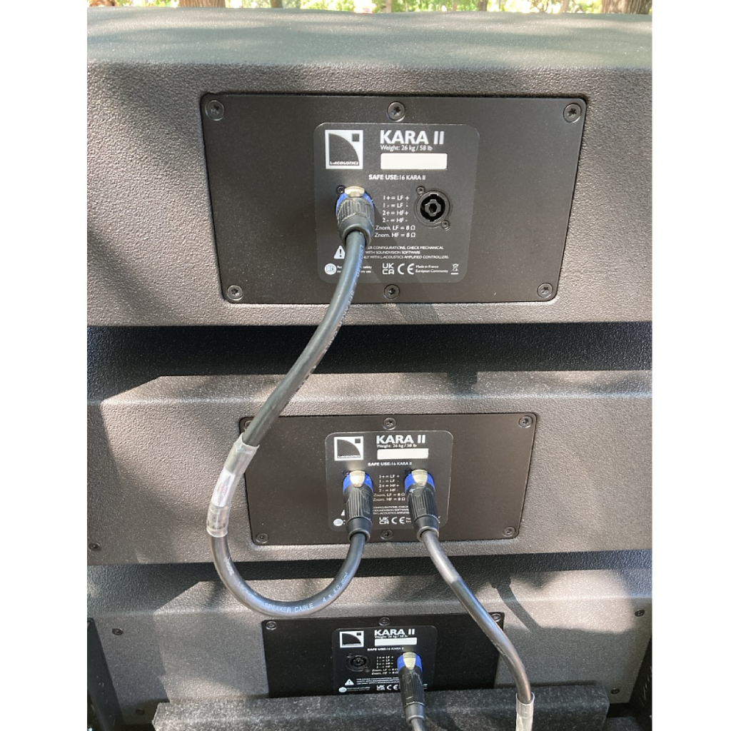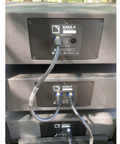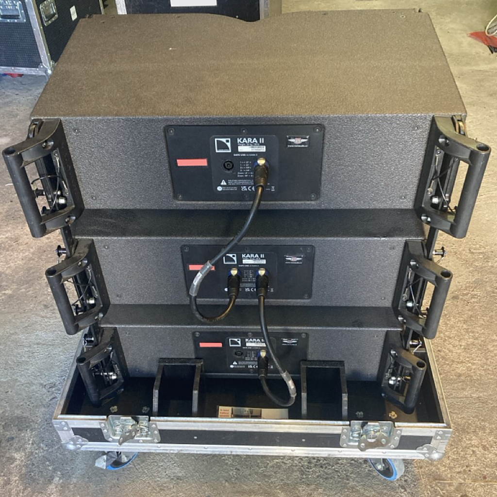 Kara II is part of L-Acoustics’ K Series: a modular long-throw line source system, using passive full-range loudspeaker boxes (tops) (dual 8″ LF + 3″ HF) with “variable curvature” line array design.